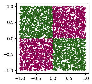 y = ((X[:,0] >= 0) ^ (X[:,1] >= 0)).astype(float)I have generated pairs of random numbers between -1 and 1 and separated them into four quadrants. Each data point represents one of the four cases in the XOR function. The corresponding output labels are either 0 or 1. Next, we define the neural network.