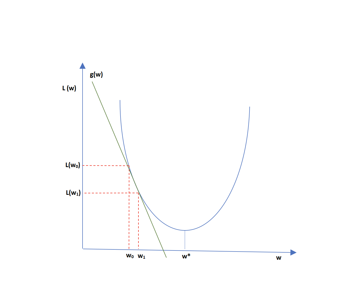 The gradient Descent algorithm takes steps proportional to the negative of the function’s gradient to compute the next most optimal point from the current point. If \(L(w)\) is convex, we can use gradient descent algorithm to reach the optimal value of \(w^{*}\). Let us assume we start with parameter set $w_0$ as shown in figure 6. The computed cost function at \(w_0\) will be \(L(w_0)\). Now the tangent line represented as \(g(w)\) is slope or gradient at point (\(w_0\), \(L(w_0)\)). Moving in the negative direction of this slope, we get \(w_1\) and \(L(w_1)\), where \(L(w_1) \le L(w_0)\). Moving similarly, computing gradient at \(w_1\) and then moving in the negative direction can lead us close to \(w^*\), which minimizes \(L(w)\). This is essentially the concept of gradient descent.