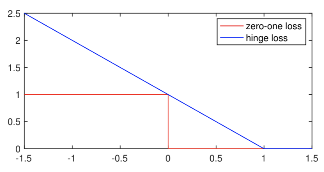 \[\hat{y}= \begin{cases} 0 & f_w(x)\geq 0 \\ 1 & otherwise \end{cases}\]The zero-one loss function is not as convenient as the quadratic loss, since the zero-one loss is a non-convex function. Also, the derivative of the zero-one loss is mostly zero everywhere, meaning the gradient does not provide information to update the model parameters. In such situations, one typically optimizes a surrogate loss function instead, for example, we can use an approximation of the zero-one loss, called the hinge loss.
