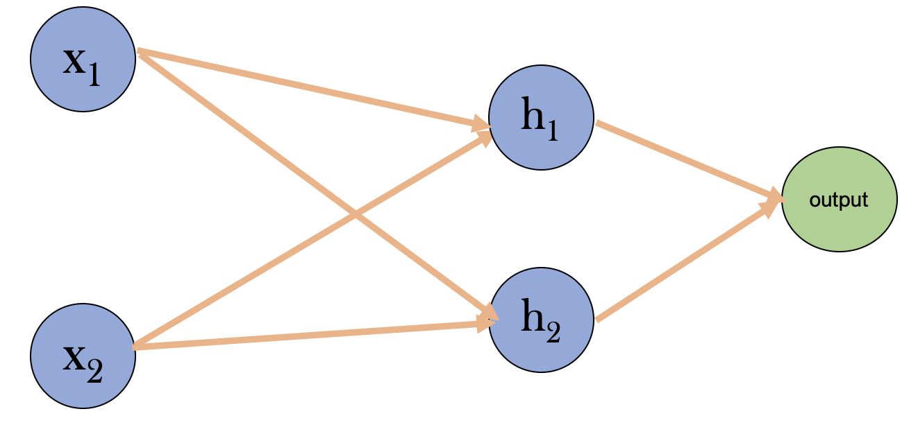 So let’s choose a neural network with a single hidden layer with two neurons. In that case, our input vector is 2-dimensional, and the output is 0 or 1. The weight matrix between the input and the hidden layer is denoted by \(w_{1}\) and has a dimension of \((2,2)\). In contrast, the weights between the hidden layer and the output (denoted by \(w_{1}\)) have dimensions \((1,2)\). In general, the dimension of the weight matrix for any arbitrary hidden layer is given by \((n_{l},n_{l-1})\) where \(n_{l}\) and \(n_{l-1}\) are the number of neurons in the current and the previous layer respectively.
