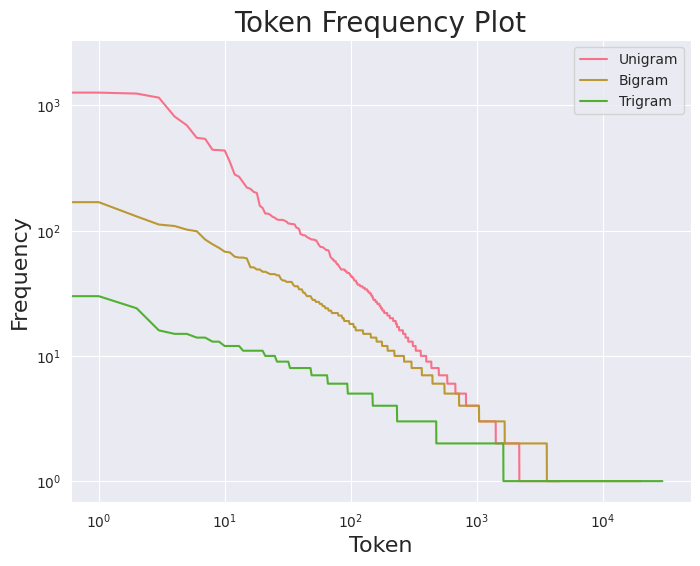 \[\begin{equation} \log n_i = -\log i + c \end{equation}\]where \(n_i\) is the frequency of the i\(^{th}\) word, where \(\alpha\) is the exponent that characterizes the distribution and $c$ is a constant. \(\alpha\) decreases with higher n in n-gram models, depending on the sequence length.