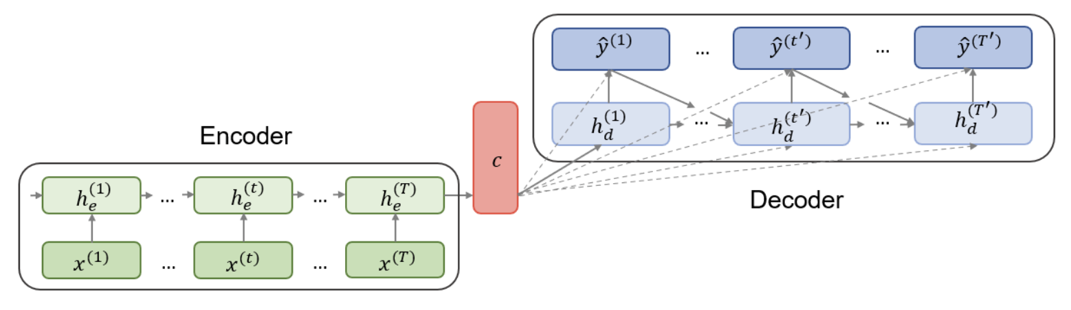 The seq2seq model comprises two components. The first, an encoder, is an RNN trained on input sequences to create a fixed-dimension summary vector $\boldsymbol{c}$, commonly referred to as the context. This vector is typically a function of the last hidden state, with Sutskever, Vinyals, & Le (2014) opting to use the final encoder hidden state as the context such that $\boldsymbol{c} = h_{(T)}^{e}$. The second component, the decoder, is another RNN which generates predictions given the context $\boldsymbol{c}$ and all previous outputs. In deviation from a simple RNN, decoder hidden states $h_{(t)}^{d}$ are conditioned on the previous outputs $y_{(t)}$, previous hidden states $h_{(t)}^{d}$, and the summary vector $\boldsymbol{c}$ from the encoder. Hence, the conditional distribution of the one-step prediction is obtained as follows: